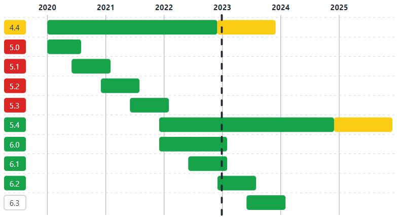 Der Release-Zyklus von Symfony verspricht für die Version 5.4 einen Support bis November 2025. Da Drupal 10 sogar auf der Version 6 basiert, ist eine Drupal 10 Seite zukunftssicher. Durch die neue Symfony Version wird aber PHP 7 nicht mehr unterstützt, weshalb PHP 8.1 für Drupal 10 benötigt wird.